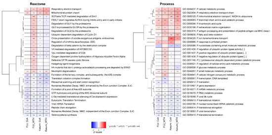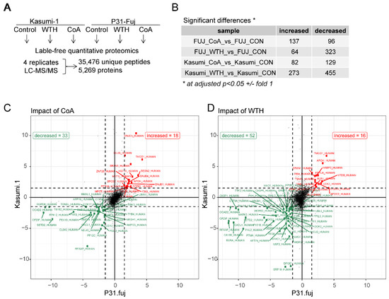To investigate the mode of action of WTH and CoA, we first performed a proteomic analysis of Kasumi-1 and P31-Fuj cells treated with 10 µM of WTH or 60 µM of CoA for 24 h. The experiment was performed with four replicates. We identified and quantified 35,476 unique peptides belonging to 5269 proteins with an FDR < 0.01 (Figure 2A). Metabolite treatment produced large changes in the proteome of these cells with WTH having a larger impact on the proteome than CoA (Figure 2B). Thus, WTH treatment reduced the expression of 323 and 455 proteins in P31-Fuj and Kasumi-1, respectively, whereas CoA reduced the expression of 96 and 126 proteins in these cells (Figure 2B). Both metabolites had a larger impact in reducing protein expression than in increasing expression.