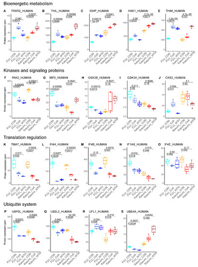 Withanolides produce changes in expression of proteins with key roles in cell biology. Shown are a selection of proteins with roles in bioenergetic metabolism (A–E), kinase signaling (F–J), translation (K–O) and the ubiquitin system (P–S). Numbers linking conditions denote p-values obtained by t-test (n = 4). Data points showing treatments to P31-Fuj are shown in shades of blue; treatments to Kasumi-1 cell lines are known in shades of red/brown.
