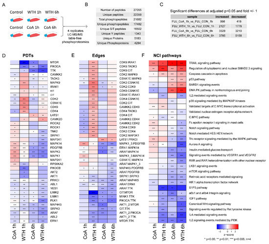 Phosphoproteomic analysis of withanolide-treated cells. (A) Experimental design. (B) Summary of quantitative data. (C) Number of phosphopeptides changes induced by WTH and CoA at the named time points. (D–F) CoA and WTH induced changes in kinase activities (D), kinase axes (E) and pathways (F). Z-scores and p-values were calculated for the named cell lines and treatment using the PAGE and Kolmogorov-Smirnoff test, respectively (see Methods for details).