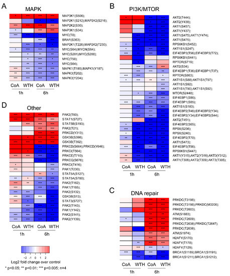 The withanolides induce pleiotropic effects in the phosphorylation of pro-survival signaling proteins. Shown are changes in phosphorylation sites in mitogen-activated protein kinase (MAPK) (A), phosphatidylinositol 3-kinase/ mammalian target of rapamycin (PI3K/MTOR) (B), DNA repair (C) and other signaling pathways (D) induced by withanolide treatment at the indicated time points. p-values were calculated by t-test (n = 4).