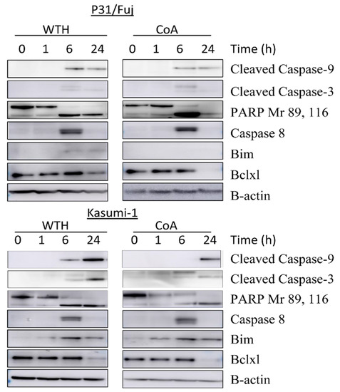 To screen the markers of apoptosis, cells were treated with 15 µM of WTH and 60 µM of CoA and incubated for 1 h, 6 h and 24 h. Cells were thoroughly washed with cold PBS lysed using lysis buffer, composed of radioimmunoprecipitation assay buffer (RIPA) and inhibitors. Protein was quantified using a bovine serum albumin (BSA) assay. An aliquot of 60 mg protein was loaded to wells of sodium dodecyl sulphate-polyacrylamide gel electrophoresis (SDS-PAGE) and transferred to nitrocellulose membrane. Membrane was blocked with non-fat dry milk and immunodetected with primary antibodies from Cell signaling technology (CST) (Mabledon Place, London, UK) including poly (ADP-ribose) polymerase (PARP) (CST#9542), Bclxl (CST#2762), caspase-8 (CST#9746), caspase-9 (CST#9501), , caspase-3 (CST#9661) and anti-b-actin (CST#4967), and Bim (ab230531) from Abcam (Cambridge biomedical campus, Cambridge, UK), followed by secondary antibodies. The concentration of each antibody was used according to manufacturer’s protocol.