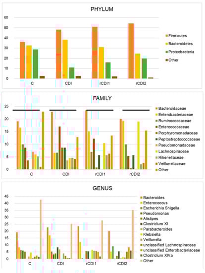Supplementary Materials can be found at https://www.mdpi.com/2227-9059/8/9/335/s1. Supplementary Tables S1–S4: relative abundances of bacterial taxa in individual samples. Supplementary Figure S1: taxa displaying significantly different relative abundances in the following comparisons: C vs. CDI vs. rCDI1 (A); C vs. CDI vs. rCDI1 (B).