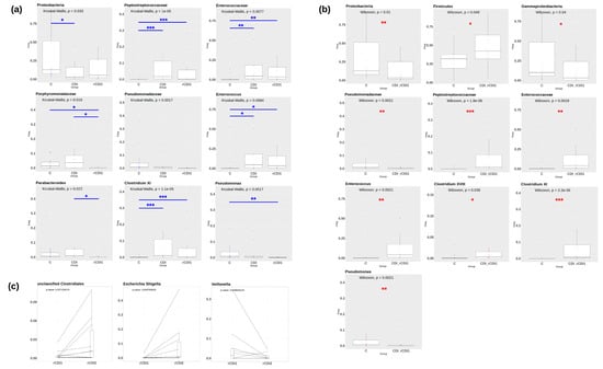 Taxa displaying significantly different relative abundances in the following comparisons: C vs. CDI vs. rCDI1 (a); C vs. CDI + rCDI1 (b); rCDI1 vs. rCDI2 (c). Pairwise comparisons producing significant p-values are indicated as * (p < 0.05); ** (p < 0.01); *** (p < 0.001). The cut-off value for taxa prevalence was set at 10%. Comparisons between patient categories are indicated over the boxplots. Values for paired Wilcoxon (C) are indicated in red. C = non-infected controls; CDI = non-recurrent C. difficile infection; rCDI1 = recurrent C. difficile infection, first episode; rCDI2 = recurrent C. difficile infection, second episode.