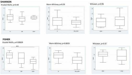 The within-sample diversity (α-diversity) was evaluated by computing observed richness, ACE, Shannon and Fisher indices. Figure 3 reports the boxplots for the taxonomic rank of classes and for the following comparisons: (i) C vs. CDI vs. rCDI1; (ii) C vs. CDI + rCDI1; (iii) rCDI1 vs. rCDI2 using the Wilcoxon rank-sum test for paired data. The purposes of these comparisons and the clinical questions linked to each of them have been explained in Section 2.1.