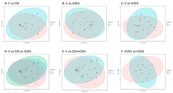 The between-sample diversity (β-diversity) was evaluated by computing the Bray–Curtis dissimilarity matrix and visualized through PCoA, both considering the three comparisons already used for α-diversity analysis and following pairwise comparisons: C vs. CDI, C vs. rCDI, CDI vs. rCDI. The analyses suggested a similar overall structure for all bacterial consortia, without a clear clustering of patient groups classes. This was observed for taxonomic rank of classes (Figure 4) as well as for all other ranks.