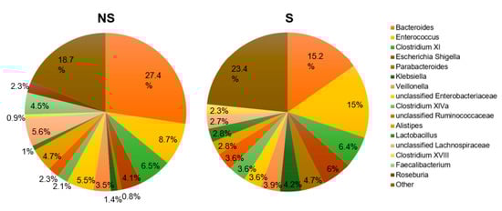 Figure 5 shows pie charts for the two categories, considering the taxonomic levels of phyla, families and genera. Statistical analyses (conducted as described above) revealed that no significant differences were observed in S and NS infections either in microbiota taxonomic composition or in ecological indexes of α- and β-diversity when clustering patients based on disease severity.