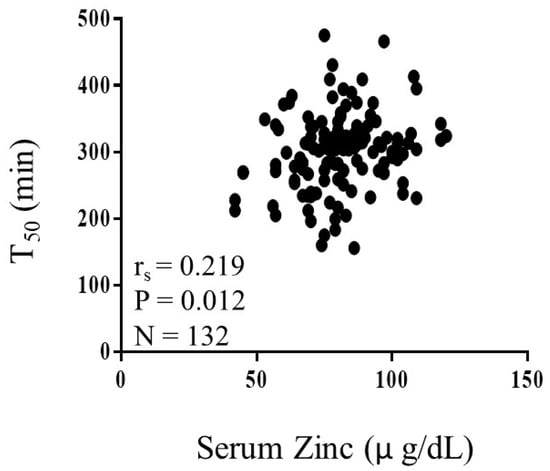Table 2 shows the unadjusted correlations between serum T50 levels and various clinical parameters in type 2 diabetes patients. While serum T50 was weakly, but positively correlated with zinc (rs = 0.219, p = 0.012, Figure 1), eGFR (rs = 0.199, p = 0.022), and fasting plasma glucose (rs = 0.282, p = 0.001), it was not significantly correlated with serum magnesium or hemoglobin A1c. Serum T50 level was negatively correlated with urinary albumin-creatinine ratio (rs = −0.247, p = 0.004), blood urea nitrogen (rs = −0.213, p = 0.011), and serum phosphate (rs = −0.227, p = 0.009).