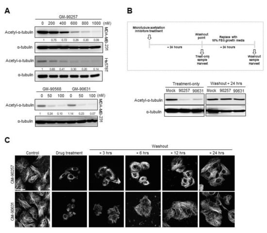 All three chemical compounds effectively reduced the level of acetyl-α-tubulin in MDA-MB-231 and Hs578T cells in a concentration-dependent manner. In particular, compared with GM-90257, GM-90568 and GM-90631 showed improved inhibitory effects (Figure 2A). The inhibition of acetyl-α-tubulin was abrogated within 24 h after the removal of the compounds from the cells (Figure 2B); however, there was no significant change in the level of histone H3 acetylation in the sample treated with GM-90631 (Supplementary Materials Figure S1B). Immunocytochemistry also showed that microtubule lattices were restored in a time-dependent manner after the washout of the inhibitors (Figure 2C), indicating that the inhibitors disrupted the microtubule structure. The expression of tubulin was not altered; however, both acetylated-α-tubulin and stable microtubule bundles were greatly reduced based on fluorescence microscopy (Supplementary Materials Figure S1C). Taken together, these results indicated that all three compounds could directly inhibit microtubule acetylation without any other side effects.