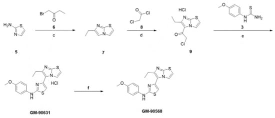 Synthesis scheme of GM-90568 and GM-90631. Reagents and conditions: (c) 1-bromobutan-2-one, ethanol, reflux, 18 h; (d) chloroacetyl chloride, 1,4-dioxane, 120 °C, 10 min; (e) 1-(4-methoxyphenyl)thiourea, ethanol, reflux, 20 h; (f) aqueous NaHCO3, room temperature, 30 min.