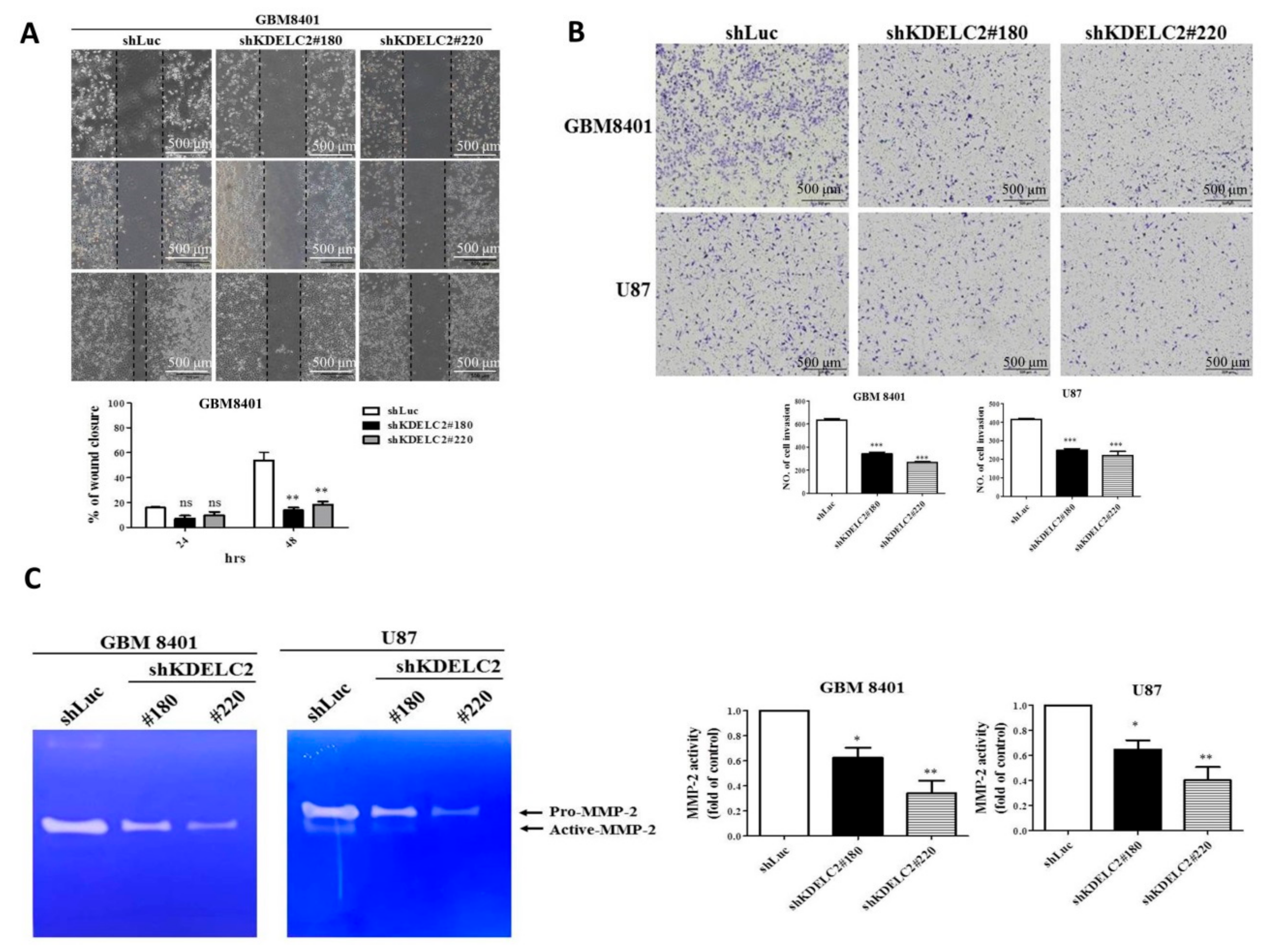 3.6. KDELC2 Knockdown Inhibited Tumor Migration and Invasion of GBMs by Downregulating Matrix Metalloproteinase-2 (MMP2) Expression