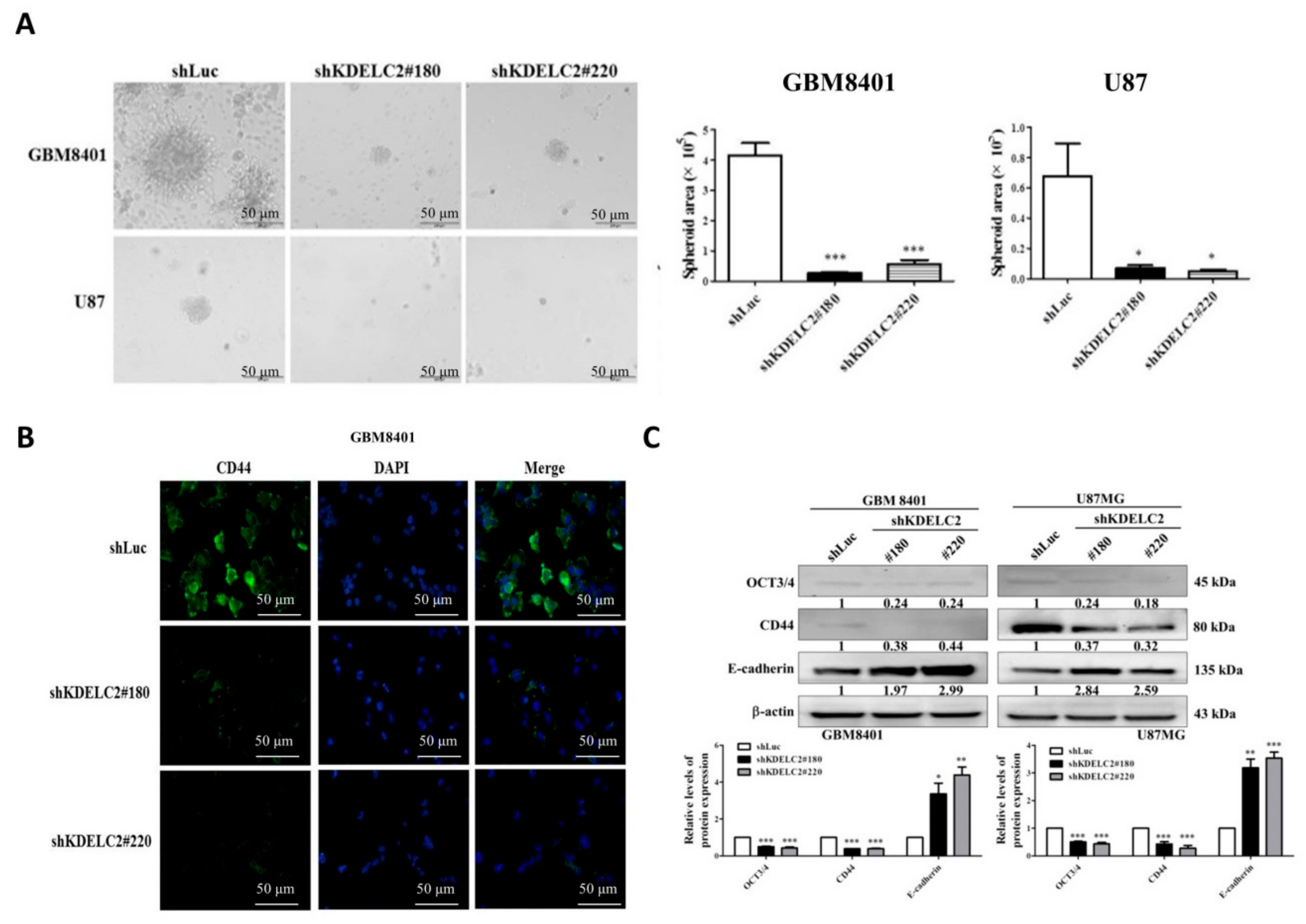 3.7. KDELC2 Knockdown Suppressed 3D Tumor Spheroid Formation and Stemness Factors’ Expression of GBMs