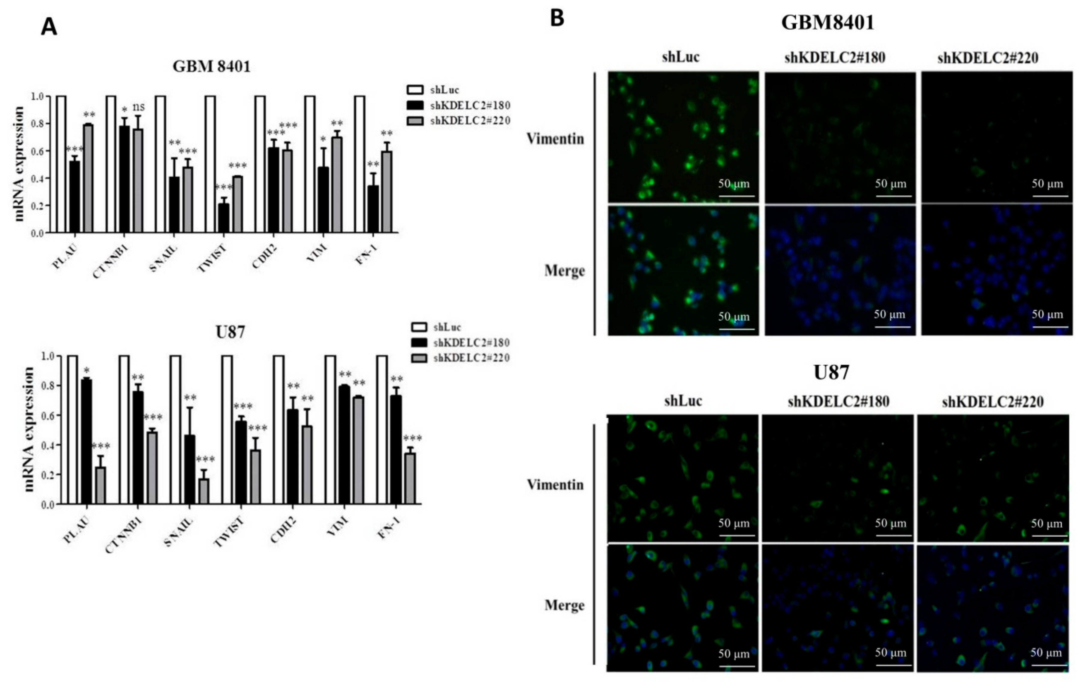 3.8. KDELC2 Knockdown Inhibited Epithelial–Mesenchymal Transition of GBMs