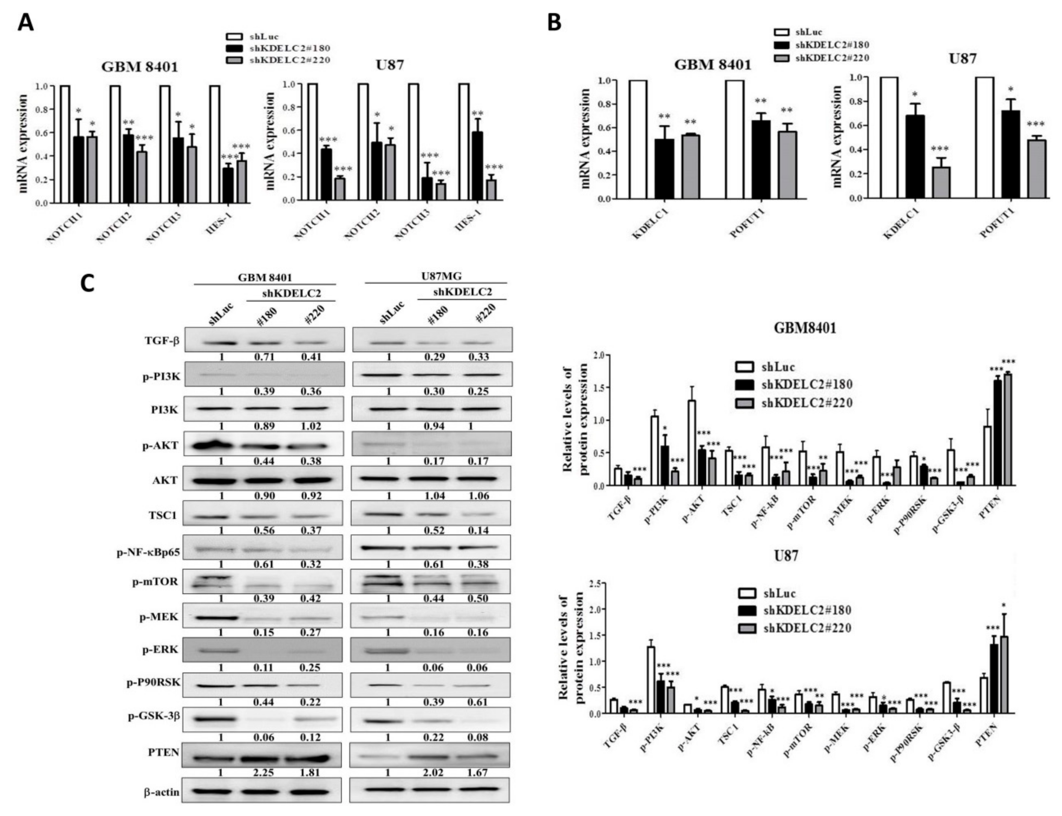 3.10. KDELC2 Knockdown Downregulated PI3k/mTOR/Akt, MAPK/ERK, and NF/kB Signaling Pathways by Suppression of Notch Receptor Expression