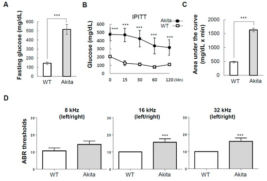 Akita mouse is an animal model of type 1 diabetes caused by pancreatic β-cell failure [25]. We first evaluated fasting glucose levels in wild-type (WT) and Akita mice (Figure 1A). The Akita group had significantly impaired glucose levels (145 ± 12.3 vs. 516 ± 53.2) and insulin sensitivity compared to the WT group at 0, 15, 30, 60, and 120 min after subcutaneous injection of insulin (AUC: IPITT, 477 ± 33 vs. 1632 ± 66) (Figure 1B,C). At 3 months, the Akita group showed significantly increased ABR thresholds at 16 and 32 kHz compared to the WT group (16 kHz, 5.6 dB ± 1.2; 32 kHz, 5.9 dB ± 1.1 shift) (Figure 1D). This result indicates that type 1 diabetes causes hearing impairment.