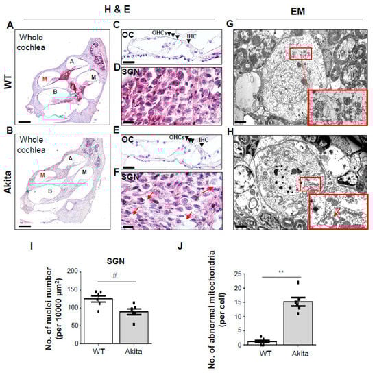 Histopathological analysis of the organ of Corti (OC) and spiral ganglion neurons (SGNs). (A,B) H&E staining of WT and Akita cochleae. Whole cochleae (scale bar, 250 μm), (C,E) OCs (scale bar, 30 μm), and (D,F) SGNs in the middle turn of the cochlea (scale bar, 10 μm). The black arrowheads indicate inner hair cells (IHCs) and outer hair cells (OHCs); the loss of SGNs is indicated by a red arrow. (G,H) Transmission electron micrograph (TEM) of SGNs in the middle turns of WT and Akita cochleae. Red boxes are zoom-ins showing mitochondria morphology. Abnormal mitochondria shapes (red arrows) can frequently be seen in the Akita group compared to WT. Scale bar, 2 μm. (I) Quantification of the number of SGNs in the middle turns of the cochlea. The average number of SGNs per 10,000 μm2 in the middle turns of cochlea tissue from WT and Akita mice. Individual squares or circles represent individual mice (n = 6 for each group). (J) The numbers of abnormal mitochondria between WT and Akita mice were quantified using Image J (n = 6 images/group). Results are means ± SEM. # p < 0.05 and ** p < 0.01 by Student’s t-test.