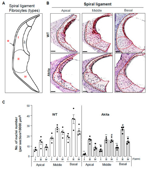 The fibrocytes of the SL are divided into four cell types based on histological characteristics, immunostaining patterns, and general location [27,28]. We analyzed the histology of the SL based on a schematic diagram of the four fibrocyte classes in the SL (Figure 4A). Interestingly, severe shrinkage and a significant decrease in the cell numbers of type I fibrocytes was observed from the apical to basal sections in Akita mice compared to WT (Figure 4B). Also, type II and IV fibrocytes showed significantly decreased cell numbers in the middle and basal sections, but not the apical turn, in the Akita group compared to the WT group. These changes were quantitated and are shown in Figure 4C.