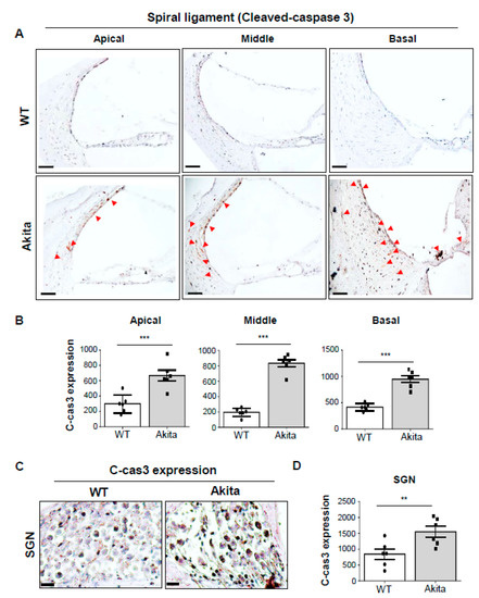 Apoptosis occurs through the sequential actions of caspases, such as caspase-3, which is initiated by their associated extrinsic and intrinsic pathways [29]. The caspase-dependent cell death pathway has been widely implicated in the programmed cell death of IHCs and OHCs [30,31]. Also, a previous study found that an apoptosis index was increased in fibroblast cells of the cochlear LW in gentamicin (ototoxic drug)-induced hearing-impaired rat cochleae [32]. Our data showed higher expression of cleaved caspase-3 in the SV and type I, II, and IV fibrocytes of Akita mice compared to the WT group (Figure 6A,B). Cleaved caspase-3 was strongly expressed in the basal turn of the OC and nerve fibers. The changes were observed and quantified in the SGNs (Figure 6C,D). This result is similar to the reduction in SV thickness, the loss of type I, II, and IV fibrocytes and SGNs, and the reduction in Na+/K+-ATPase α1.