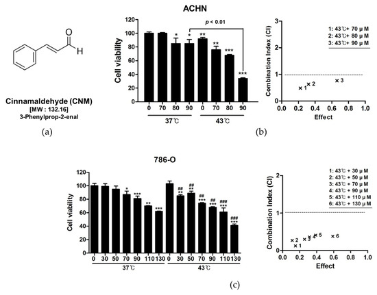 Effect of cinnamaldehyde (CNM) and hyperthermia combination on cell viability in renal cell carcinoma (RCC) cell lines. RCC cell lines, including ACHN and 786-O cells, were treated with CNM with or without hyperthermia of 43 °C and incubated for 24 h. (a) Structure of CNM. Cell viability was measured by the 3-(4,5-dimethylthiazol-2-yl)-2,5-diphenyltetrazolium bromide (MTT) assay and the combination index was determined using Compusyn Software in (b) ACHN cells and (c) 786-O cells. * p < 0.05, ** p < 0.01, *** p < 0.001 vs. 37 °C control group; ## p < 0.01, ### p < 0.001 vs. hyperthermia treatment group.