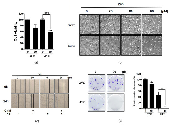 A total of 400 cells/well were seeded in a 6-well plate and incubated overnight. The following day, the cells were treated with 90 μM CNM for 1 h and consequently incubated at 37 or 43 °C for 30 min for hyperthermia treatment. After 2 weeks, the cells were stained with crystal violet (Sigma-Aldrich, St. Louis, MO, USA) solution at room temperature (RT) for 10 min and washed with PBS. Images of colonies were captured by a microscope (CX-40, Olympus, Tokyo, Japan).