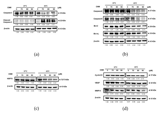 To elucidate the molecular mechanism participating in the synergistic effect of CNM and hyperthermia co-treatment, we next examined the expression levels of factors related to apoptosis, proliferation, metastasis, and angiogenesis. As in Figure 3a, co-treatment with CNM and hyperthermia of 43 °C greatly induced the cleavage of caspase-3, the final step in programmed apoptosis [16]. However, such an effect was not shown by CNM treatment in 37 °C.