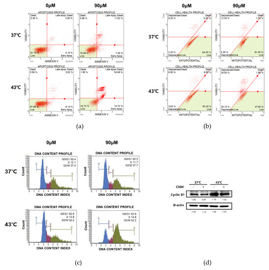 Cell cycle arrest is closely related to the induction of apoptosis; thus, it is frequently used as the therapeutic target of anticancer agents [23]. To investigate whether cell cycle arrest also occurs in the action mechanism of CNM and hyperthermia combination treatment, flow cytometry analyses were carried out. As shown in Figure 4a, CNM treatment accompanied by 43 °C hyperthermia clearly increased the Annexin V-associated apoptotic profile of ACHN cells when compared to either sole treatment of 43 °C hyperthermia or the combination of CNM and 37 °C normothermia. Mitochondrial membrane potential changes have been implicated in apoptosis, as depolarization of the inner mitochondrial membrane potential is a reliable indicator of cellular health [24]. Therefore, we analyzed the changes of the mitochondrial membrane potential in ACHN cells. The results suggested that the combination treatment with CNM and 43 °C hyperthermia showed a drastic change in the dead cell count than the 37 °C co-treatment (30.50% vs. 12.35%) consistent with the Annexin V staining results (Figure 4b). Next, we analyzed the profile change of the cell cycle in cells treated with CNM and hyperthermia. As in Figure 4c,d, results indicated cell cycle arrest was induced at the G2/M phase by co-treatment of CNM and 43 °C hyperthermia, and this was due to a decrease in Cyclin B1, the key regulator of cellular mitosis [25].