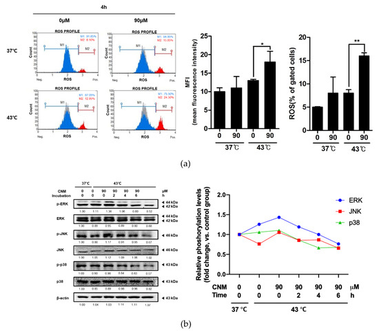 The molecular mechanism of hyperthermia treatment leading to apoptosis in cancer cells is known to be related to the ROS signaling pathway [10]. Furthermore, ROS itself is already considered as a promising molecular target for the treatment of cancer [26], as well as a novel target for herbal treatments in cancer [27]. Thus, ROS signaling was assessed using a flow cytometry assay kit. As shown in Figure 5a, co-treatment with CNM and 43 °C hyperthermia resulted in a highly increased ROS intensity compared to cells that underwent the 43 °C hyperthermia treatment only. The phosphorylation levels of mitogen-activated protein kinases (MAPKs), crucial regulators of cellular fate [28] but also important downstream pathways of ROS signaling [29], were evaluated by a Western blot assay as well. As a result, CNM and hyperthermia combination treatment induced increase of phosphorylation of all three MAPKs (1.43-fold, 1.05-fold and 1.10-fold vs. 37 °C control group in ERK, JNK and p38, respectively, calculated by phosphor-form/total-form). When compared to 43 °C hyperthermia-treated control ACHN cells, CNM increased phosphorylation of ERK (14.4% increase) and JNK (36.8% increase) but not p38 at the starting point of incubation, by a gradual time-dependent decrease (Figure 5b).