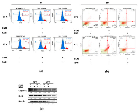 Our next goal was to evaluate the exact role of ROS in the action mechanism of the combination treatment with CNM and hyperthermia. We applied NAC, a scavenger of free radicals and thus an ROS inhibitor [30], prior to the combination treatment of CNM and hyperthermia. NAC pre-treatment indeed suppressed ROS expression (Figure 6a). Moreover, as shown in Figure 6b, further analysis regarding Annexin V indicated that the CNM and hyperthermia treatment failed to induce apoptosis in ACHN cells, suggesting the key role of ROS in the effect of such a combination treatment. In addition, neither the expression of caspase-3 nor Bcl-2 was not altered by co-treatment of CNM and hyperthermia when ROS signaling was inhibited by NAC pre-treatment (Figure 6c).