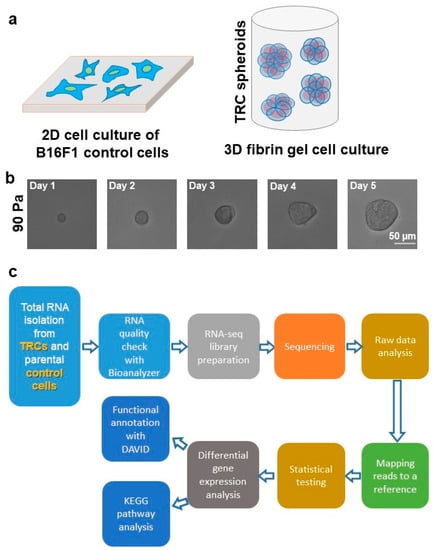 The cell–cell and cell–matrix interactions are different in 2D vs. 3D culture conditions because of the spatial arrangements (Figure 1a). Furthermore, critical cellular functions, such as cell growth, proliferation, spreading, crawling, migration, and contractility, are regulated by not only in 2D and 3D microenvironments but also by the physical properties of the microenvironment, such as stiffness [25]. Established cell lines, such as parental B16F1 cells, are traditionally cultured on tissue 2D culture treated rigid dishes. Previous studies, including our own, demonstrated that 3D fibrin gel of 90 Pa stiffness promotes the growth and selection of multicellular TRC spheroids [14,16,17,18]. Growing evidence also reports similar findings that physical properties of the cellular microenvironment, such as stiffness, have an important role in promoting tumorigenic cancer cell growth [26,27]. Based on this, we seeded single B16F1 melanoma cells in 90 Pa soft 3D fibrin gels. The majority of the cells do not survive the soft 3D microenvironment, which is consistent with published reports [14,16,17,18]. We tracked and imaged single cells up to 5 days (Figure 1b). Figure 1b shows a single tracked cell growing into a multicellular TRC spheroid over a 5-day culture period. These mechanically selected TRCs have been shown to be highly tumorigenic [14,16,17,18]. However, it remains largely unknown how these tumorigenic TRCs are different from parental B16F1 control cells in terms of gene expression and gene regulatory network. To obtain a thorough understanding of differentially expressed genes of TRCs compared to parental B16F1 control cells, we profiled the whole transcriptome by the next-generation sequencing based RNA sequencing (RNA-seq) technique. Figure 1c shows the flow diagram of RNA-seq and subsequent data analysis strategy. Total RNA was isolated from parental B16F1 cells and soft 3D fibrin derived TRCs. The total RNA purity and integrity were evaluated by RNA integrity number (RIN) and subsequently, the RNA-seq library was prepared for sequencing. The raw RNA-seq data were mapped to a reference sequence and differentially expressed genes (DEGs) were obtained after statistical testing. Finally, for all DEGs, GO analysis and pathway enrichment analysis were carried out by the online tools DAVID and KEGG pathway analysis, respectively.