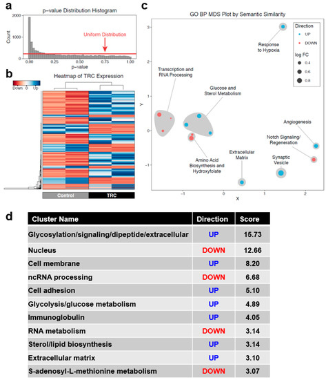 A summary of the RNA-seq data is reported here. (a) The RNA-seq experiment demonstrates significant deviation away from the theoretical uniform distribution (red line) with a spike towards zero, indicating that there are marked alterations in global expression measured in this experiment. (b) Genes differentially expressed at FDR < 0.05 and expression ≥ two-fold show strong differences between TRCs and parental control cells. (c) Non-metric MDS on semantic similarity of GO Biological Process terms altered in TRCs relative to parental control cells demonstrates a few discrete clusters of terms related to assorted tumor processes. (d) A summary of upregulation (blue) and downregulation (red) of different clusters is shown here.