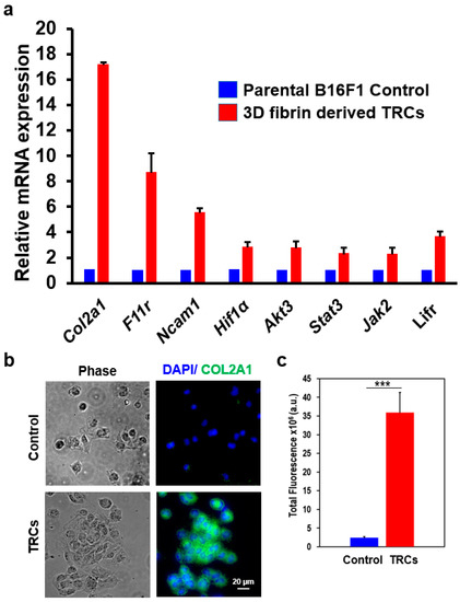 The identification of dependable biomarkers is critical for the specific targeting of tumorigenic cancer cells. Soft 3D fibrin gel selected TRCs, a subpopulation of the B16F1 cell line, have been demonstrated to be highly tumorigenic. The expression level of Cd133, a cancer stem cell marker, in TRCs was found to be identical to parental B16F1 control cells [14]. Therefore, conventional biomarkers, such as CD133, cannot be used to reliably select and target TRCs. Our current study reveals a highly specific and novel suite of biomarkers of TRCs including the top candidate Col2a1. Real-time qPCR data and immunocytochemistry data validated that the Col2a1 transcript and the protein it encodes are indeed specifically expressed in TRCs. It is interesting to note that Col2a1 encodes a component of type-II collagen, named the pro-alpha1(II) chain. It is first expressed during eye development and in the cartilage cells of a fully developed animal. Besides the adhesion supporting role, Col2a1 has been associated with cell signaling pathways, such as transforming growth factor-β (TGF-β)/Smad signaling, which is known to promote metastasis [37,38,39]. Moreover, similar to the cartilage matrix, which is rich in type II collagen, the building blocks of the tumor niches may be provided by the availability of type II collagen component, such as COL2A1. Therefore, it is not unreasonable to implicate the tumor repopulating cells’ ability to engineer the tumor niche. A recent report also demonstrates a similar upregulation in Col2a1 expression in breast cancer cells [40].
