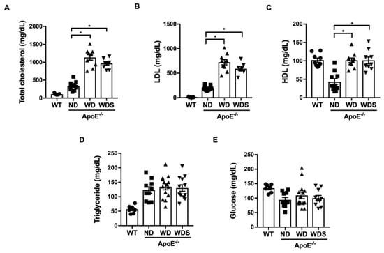 Plasma lipid and glucose level in apolipoprotein E (ApoE−/−) mice fed with normal and Western-type diets. (A) Total cholesterol, (B) low density lipoprotein (LDL), (C) high density lipoprotein (HDL), (D) triglyceride, and (E) glucose were measured in experimental groups (WT; C57BL/6J wild-type control mice, ND; ApoE−/− mice fed with a normal diet, WD; ApoE−/− mice fed with a Western-type diet, WDS; atorvastatin-treated ApoE−/− mice fed with a Western-type diet) using a chemistry analyzer. All values represent mean ± SEM, n = 8–10 animals per group. * p < 0.05, vs. ND group was determined by one-way ANOVA followed by Bonferroni’s multiple compare test.