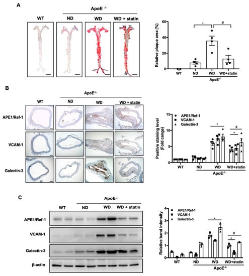 Aorta tissues, harvested from ApoE−/− and C57BL/6J mice, were chopped in radioimmunoprecipitation assay (RIPA) buffer (Cell Signaling Technology, Danvers, MA, USA) and homogenized using a sonicator (Hielscher, Teltow, Germany). Aorta tissue was centrifuged at 12,000 rpm for 15 min and the supernatant was collected. Aorta lysates were subjected to 10% sodium dodecyl sulfate polyacrylamide gel electrophoresis (SDS-PAGE), followed by immunoblotting using anti-vascular cell adhesion molecule-1 (VCAM-1) (1:1000, cat.# MAB6434) or anti-galectin-3 (1:000, cat.# AF1197) from R&D Systems (Minneapolis, MN, USA), anti-APE1/Ref-1 (1:1000, cat.# MR-MA14) from MediRedox (Daejeon, Korea), and anti-β-actin (1:5000, cat.# A5316) from Sigma-Aldrich (St. Louis, MI, USA).