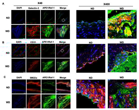 Atherosclerotic plaques consist of a heterogeneous population of cells including endothelial and smooth muscle cells, macrophages, and/or transdifferentiated cells such as foam cells [,]. Therefore, we next examined cellular co-localization of APE1/Ref-1 in the aortas of ApoE−/− mice fed with a Western-type diet (WD). To identify macrophages, endothelial cells, and smooth muscle cells in atherosclerotic plaques, we utilized specific fluorescence imaging using cell-specific markers in tissue sections of the mouse aorta. As shown in Figure 4A, the expression of the macrophage marker [] galectin-3 (red) was not detected in the aortas of ApoE−/− mice fed with a normal diet (ND), but was increased in ApoE−/− mice fed with a Western-type diet (WD). APE1/Ref-1 (green) was highly expressed in WD mice, and the signal for APE1/Ref-1 was merged with that for galectin-3 (red), thereby indicating the co-localization of APE1/Ref-1 in macrophages. As shown in Figure 4B, the signal for APE1/Ref-1 (green) was mainly merged with that for CD31 (red), which is a specific marker for endothelial cells [] in the aortas of WD mice, this suggests that APE1/Ref-1 expression was upregulated in the endothelial layer. As shown in Figure 4C, the signal for SM22𝛼 (red), a specific marker for smooth muscle cells [], was not merged with the signal for APE1/Ref-1 (green) in the aortic tissues of ApoE−/− mice fed with a normal (ND) or a Western-type diet (WD). These results suggest that upregulated APE1/Ref-1 expression in ApoE−/− mice fed with a Western-type diet may have been derived from macrophages and endothelial cells in atherosclerotic plaques.