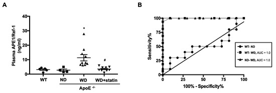 Plasma APE1/Ref-1 level was significantly elevated in ApoE−/− mice fed with a Western-type diet. (A) Quantitative analysis of plasma APE1/Ref-1 levels in each experimental group (WT; C57BL/6J wild-type control mice, ND; ApoE−/− mice fed with a normal diet, WD; ApoE−/− mice fed with a Western-type diet, WD + statin; atorvastatin-treated ApoE−/− mice fed with a Western-type diet) was performed using an enzyme-linked immunosorbent assay (ELISA). Results are represented as mean ± S.E.M., n = 5–10. * p < 0.05, vs. ND group, # p < 0.05, vs. WD group was determined using one-way ANOVA followed by the Bonferroni’s multiple comparison test. (B) Receiver operating curves of plasma APE1/Ref-1 levels for the diagnosis of atherosclerosis in ApoE−/− mice fed with a Western-type diet (WD) compared with those of wildtype control mice (WT). Area under curve (AUC) (◼) = 1.00; p < 0.0001. Receiver operating curves of plasma APE1/Ref-1 levels for the diagnosis of atherosclerosis in ApoE−/− mice fed with a Western-type diet (WD) compared with those of ApoE−/− mice fed with a normal diet (ND). Area under curve (AUC) (▲) = 1.00; p < 0.0001. Notably, there was no significant difference between WT and ND groups.
