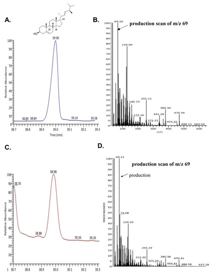 Phytosterols from Hippocampus species (Hippocampus kelloggi Jordan and Snyder, Hippocampus histrix Kaup, Hippocampus kuda Bleeker, and Hippocampus trimaculatus Leach) have been investigated in several studies [34,35]. However, phytosterols from H. abdominalis, has not been studied. Furthermore, brassciasterol from Hippocampus has not been investigated. Therefore, we checked brassicasterol in SHL. GC-MS analysis showed that brassicasterol was present in SHL (Figure 2A,B).