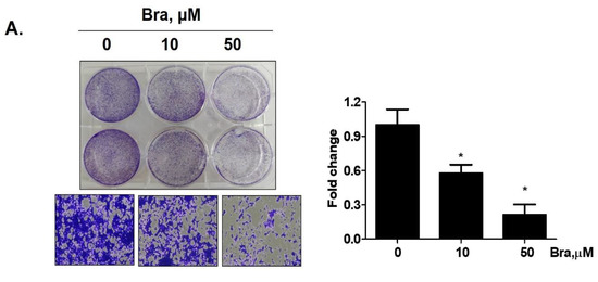 Brassicasterol (10 or 50 μM) was added to LNCaP cells for 5 days to determine whether it inhibited cancer cell proliferation after prolonged exposure. As shown in Figure 4A, brassicasterol decreased the number of LNcaP cells in a concentration-dependent manner. 50 μM brassicasterol exhibited 79% cell growth inhibitory effect (IC50 = 18.43 ± 0.052 μM).