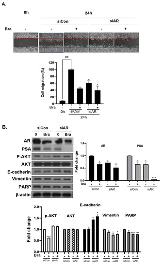 To assess whether brassicasterol-mediated cell migration, including EMT, were dependent on AR inhibition, we examined the effect of AR knockdown on migration in LNCaP cells. AR knockdown by small interfering RNA (siRNA) enhanced brassicasterol-mediated cell migration as determined using a wound-healing assay (Figure 5A). AR siRNA showed 40% cell migration inhibitory effect. Brassicasterol showed 54% cell migration inhibitory effect. We assessed whether these changes were associated with the regulation of the expression of cell proliferation and cell EMT-mediated migration regulatory proteins. AR siRNA inhibited PSA, vimentin, and PARP expression and induced E-cadherin expression. AR siRNA contributed to the anti-cancer effects of brassicasterol in LNCaP cells. However, AR knockdown did not affect the expression of phospho-AKT, as shown in Figure 5B.