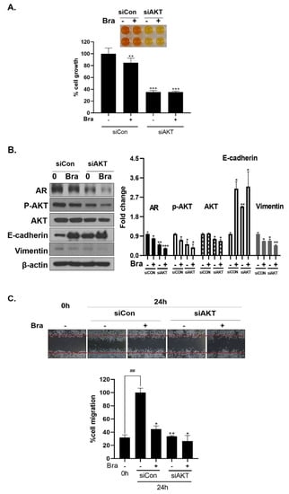 As shown in Figure 5B, AR siRNA did not control p-AKT expression levels. To assess whether AKT mediated AR signaling pathway inhibitory effect by brassicasterol, we examined the AR signaling pathway regulation by AKT siRNA. AKT knockdown showed decreased AR (0.49-fold), AKT (0.76-fold), and p-AKT (0.52-fold) expression in LNCaP cells. In addition, AKT siRNA enhanced brassicasterol-induced AR inhibition (brassicasterol, 0.79-fold; brassicasterol + AKT siRNA: 0.33-fold) (Figure 6B). Furthermore, AKT siRNA showed inhibition of cell growth and increased cell growth inhibitory effect of brassicasterol (Figure 6A,C). Brassicasterol treatment showed 18% inhibitory effect on cell growth, but cell growth inhibition of brassicasterol was increased up to 65% by AKT siRNA (Figure 6A). Furthermore, AKT knockdown exhibited suppressed cell migration compared to control of siRNA. Consistent with cell growth data, brassicasterol treatment showed 54% inhibitory effect on cell migration, but cell migration inhibition of brassicasterol was increased up to 74% by AKT siRNA (Figure 6C).