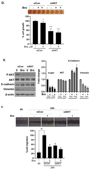 Effect of AKT siRNA on cell migration- and proliferation-related makers in Brassicasterol treated prostate cancer cells. (A–B) LNCaP cells were transfected with AKT siRNA for 48 h and were incubated in the presence or absence of brassicasterol (10 μM) for 24 h. (A) The cells growth was determined using Cellomax kit. The graph showed quantitative cell growth. (**) p < 0.01 and (***) p < 0.001 compared with control. (B) The cell lysates were prepared and subjected to Western blotting to determine the expression of AR p-AKT, AKT, E-cadherin, vimentin, and β-actin. Bar graphs represent the quantification of interest protein related to β-actin, present as a fold change of control of siRNA. (*) p < 0.05, (**) p < 0.01, and (***) p < 0.001 (in comparison to control of siRNA). (C) The cells were evaluated to cell migration by wound healing assay. Bar graph represents the quantification of cell migration, present as a percentage of control of siRNA. (*) p < 0.05, (**) p < 0.01 (in comparison to 24h control of siRNA) (##) p < 0.01 (in comparison to 0 h control). (D–F) PC-3 cells were transfected with AKT siRNA for 48 h and were incubated in the presence or absence of Brassicasterol (10 μM) for 24 h. (D) The cells were measured cell growth by Cellomax kit. The graph showed quantitative cell growth. (*) p < 0.05, and (***) p < 0.001 compared with control. (E) The cell lysates were prepared and subjected to Western blotting to determine the expression of p-AKT, AKT, E-cadherin, vimentin, and β-actin. Bar graphs represent the quantification of interest protein related to β-actin, present as a fold change of control of siRNA. (*) p < 0.05, (**) p < 0.01, and (***) p < 0.001 (in comparison to control of siRNA) (F) The cells were evaluated to cell migration by wound healing assay. Bar graph represents the quantification of cell migration, present as a percentage of control of siRNA. (*) p < 0.05(in comparison to 24 h control of siRNA) (##) p < 0.01 (in comparison to 0 h control).
