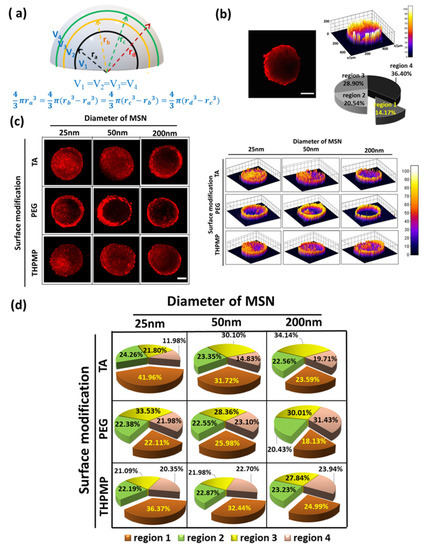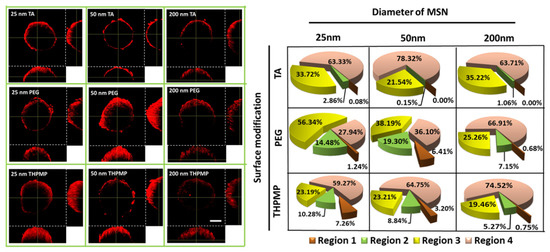 Upon examination of various MSN images at different incubation times, our results indicated that only the negatively and positively charged MSNs with diameters of 25 and 50 nm could accumulate in region one after 16 h. On the other hand, MSNs with a diameter of 200 nm showed high intensity only on the outer layers, which indicated that these MSNs were taken up by the cells but were restricted from penetrating deeper cell layers even after 24 h of incubation (Figure S4). Though both smaller MSN-TA and MSN-THPMP could penetrate deeper than the larger ones, their accumulation was also influenced by the NPs’ surface charges (MSN-TA > MSN-THPMP) [33]. On the other hand, the fluorescence of MSN-PEG, regardless of the size, was rarely observed in the core region (region 1). Moreover, the percentage of individual cells of the spheroid that took up MSN-TA, MSN-PEG and MSN-THPMP were measured to be 70.93, 44.30 and 67.68%, respectively (Figure S5).