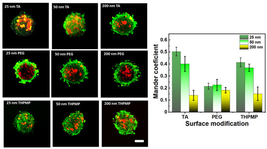 Figure 3 shows the accumulation preference of MSNs in the hypoxia region of the spheroid. The degree of MSN (green) overlapping with the hypoxia region (red) was quantified based on Mander’s overlapping coefficients. The Mander’s coefficients measure the amount or degree of colocalizing pixels or voxels in each color channel; in other words, it accounts for the numbers of MSN FITC that overlap with image-iT red dyes. The increased colocalization of green fluorescence MSNs (FITC-labeled MSN) with image-iT red dyes indicated their capability to reach and reside in the spheroid’s hypoxic region (Figure 3) [32,38]. MSN-TA and MSN-THPMP (25 nm and 50 nm) showed a higher overlapping index with the hypoxic region than other types of MSNs, which corresponded to their ability to overcome the physiological barriers leading to deep penetration and uptake into the tumor’s hypoxic and necrotic areas.