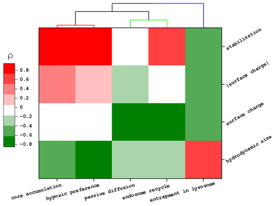 Heat map of the relationship between the physicochemical properties of MSNs and their transportation behavior. The color map represents the Spearmen coefficient value (ρ).
