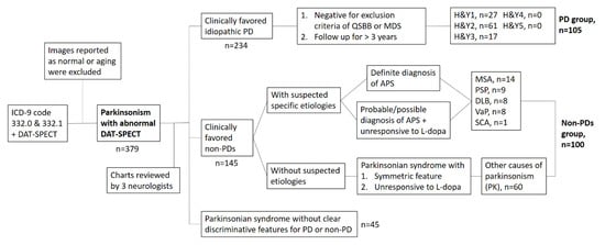 The flow chart of subject selection for artificial neural network (ANN)-classifier training. The cases with drug-induced parkinsonism which reported as normal DAT-SPECT were excluded. ICD, international classification diagnosis; DAT-SPECT, dopamine transporter single-photon emission computed tomography; PD, Parkinson’s disease; APS, atypical parkinsonian syndrome; QSBB, Queen Square Brain Bank; MDS, movement disorder society; H&Y, Hoehn and Yahr stage; MSA, multiple system atrophy; PSP, progressive supranuclear palsy; DLB, dementia with Lewy bodies; VaP, vascular parkinsonism; SCA, spinocerebellar ataxia.