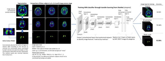 Machine learning and artificial neural networks (ANNs) have developed rapidly and been applied in clinical settings []. Recently, Vaccaro et al. demonstrated that a careful analysis of neuropsychological deficits through a machine-learning approach successfully discriminated PD and progressive supranuclear palsy []. An ANN application on DAT-SPECT images reported a classification accuracy of up to 90% in identifying PD with a mean Hoehn and Yahr (H&Y) stage of 1.6 from healthy controls [], a great leap from the 80% achieved with conventional or semi-quantitative analysis [,]. Thus, in this study, we combined appropriate segmentation of SR images derived from DAT-SPECT with a widely-used pre-trained neural network for computer-vision to investigate the efficiency of this integrated method in identification of PD from parkinsonism caused by other disorders.