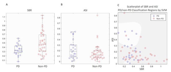 Distribution of indicators derived from semi-quantitative methods (SBR and ASI) in the test dataset (n = 57). (A) Dot diagram overlaid whisker-boxplot of SBR showed a wider range of distribution in the non-PD group. The range of the PD group almost totally overlapped with that of the non-PD group. (B) Dot diagram overlaid whisker-boxplot of ASI showed a wider range of distribution in the PD group. The range of the non-PD group almost totally overlapped with that of the PD group. (C) Scatterplot of SBR and ASI of both groups showing the classification results of median Gaussian kernel SVM with PCA. In the PD (lighter) region only one non-PD point was included, while there were 12 PD points in the non-PD’s (darker) region. The overall accuracy was 68.4% using this machine-learning method.
