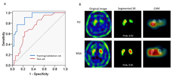 Classification of the test dataset using the ANN classifier. (A) The area under the receiver operating characteristic curve (AUROC) was 0.94 in the training/validation dataset (blue line) and 0.76 in the test dataset (red line). (B) Examples of classification using the ANN classifier for each group. Upper row is an example of PD and the lower row non-PDs. Left column: the images before scalp-mask and segmentation. Middle column: the images of segmented SR using the active contour model. Right column: the CAM represented with a heat map. The computer-vision weighted more on areas with a warmer color when examining the images. Overlaying on SR images showed that the computer focused most on the putamen. This PD subject was a 58-year-old male with symptoms of resting tremors in his right hand for 2 years and H&Y stage 2 when DAT-SPECT was obtained. Another example case of multiple system atrophy was a 69-year-old male who had symptoms of urinary incontinence, orthostatic hypotension, and cerebellar features of dysmetria and parkinsonism. The disease duration before DAT-SPECT was obtained was 2 years. Prob., probability of class.