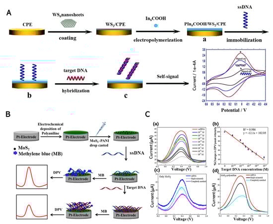 Dutta et al. (2018) proposed a platform that could successfully detect concentrations as low as 10−15 M of target DNA without labeling or amplifiers (Figure 2B) []. The Pt||MoS2-polyaniline electrode is immersed in a tris buffer (pH 6.9) containing 2.5 μM ssDNA solution, which functions as a DNA probe. This reported DNA biosensor directly senses the target through differential pulse voltammetry (DPV) and CV measurements with a wide linear range of detection (10−15 to 10−6 M). The electrochemical characteristics of methylene blue (MB) on an ssDNA/MoS2-polyaniline/Pt electrode was conducted in different conditions (Figure 2C). The sensor treated with a MoS2-polyaniline nanocomposite successfully detected the target DNA in various target DNA solution concentrations, as depicted in Figure 2C(a).