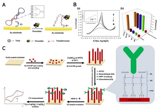 (A) Electrochemical sensor for thrombin detection. (B) DPV (a) response of different thrombin concentrations, a: 0 M, b: 1.8 × 10−13 M, c: 1.8 × 10−12 M, d: 1.8 × 10−11 M, e: 1.8 × 10−10 M, and f: 1.8 × 10−9 M target thrombin. (Insert) Calibration plots of target thrombin (1.8 × 10−13 to 1.8 × 10−9 M). Specificity of the assay for the detection of thrombin (b). (C) Biosensor for the detection of MMP-9 biomarker. (A) Spin-coating and annealing of ZnO nanoparticle seed solution, (B) ZnO nanorod growth, (C) antibody immobilization, (D) sample incubation, and (E) electrochemical measurement (CV and EIS). Chemical link between ZnO surface and antibody is illustrated on right side. Reprinted with permission from []. Copyright 2020, Elsevier; Reprinted with permission from []. Copyright 2020, Elsevier.
