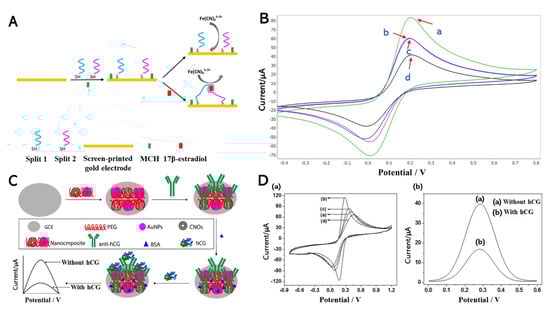 Nameghi et al. (2019) used the gold electrode and aptamers for the substrate to detect estrogen (Figure 4A). Previously, aptasensors have demonstrated satisfactory results at detecting their targets [,]. The immobilization was performed via thiol-modified split aptamers that can react with the gold surface []. CV was conducted through the proposed platform because the interfacial reaction could be determined via this method, thus enabling easy discrimination between estrogen and the control group through their signal (Figure 4B). The bare electrode presented the maximum CV current (curve A), which indicated excellent electron transfer between the bare gold electrode and [Fe(CN)6]3−/4−. When split aptamers were conjugated onto the gold electrode’s surface, the redox current decreased (curve B). From curve D, when adding the E2, the electrochemical signal was significantly reduced (curve D) because the split1–E2–split2 complex was formed on the electrode. However, in the presence of bisphenol A (BPA) as non-target substances, the current signal of the split DNA aptamer modified electrode did not change (curve C). Furthermore, DPV analysis was performed, in which the concentrations of E2 were measured from 1.2 pM to 100 pM and 100 nM to 7 nM with a detection limit of 0.5 pM (S/N = 3). The outstanding performance of the proposed biosensors demonstrates their reproducibility, high sensitivity, and selectivity.