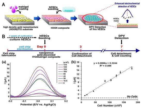 (A) Optimization of a high-density gold nanostructure (HDGN) composite for the enhancement of human embryonic stem cells (hESC) electrochemical signals; (B) (a) DPV signals achieved using various hESC quantities in the range of 12,500–179,000 cells, presented in the form of an XY graph. (b) Linear correlations (R2) between the calculated Ip value from DPV signals and the number of hESCs. Reprinted with permission from []. Copyright 2019, Elsevier.